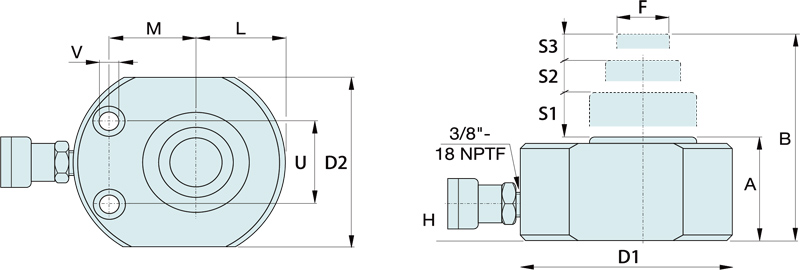 | 规格型号 | 本体高度 A (mm) | 最大行程 (mm) | 工作能力 最大行程 (kN) | 第1级 | 第2级 | 第3级 | 柱塞直径 F (mm) | 重量 (kg) | |||
