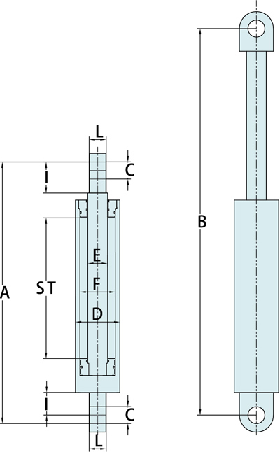 | 规格型号 | 承载 能力 (T) | 工作 行程 (mm) | 活塞范围 (扩展) (cm²) | 活塞范围 (回缩) (cm²) | 油 容量 (mm³) | 中心最 小长度 (mm) | 中心最大长度 (mm) | 外径 D (mm) | 孔径 E (mm) | 杆径 F (mm) | 中心孔到 气缸的间隙 H | 连接板厚度 L | 中心孔直径 C |