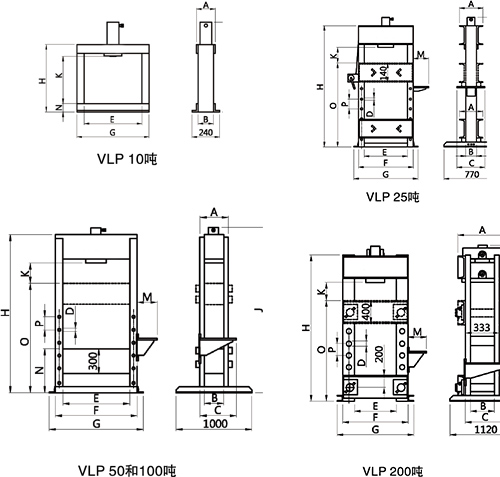 | 规格型号 | 工作能力 (T) | 最大操作空间 (mm) | 千斤顶行程 (mm) | VLP型压床尺寸 (mm) | 重量 (kg) | ||||||||||||||