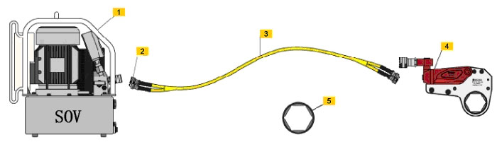 配置二、1台中空型液压扳手(由工作头和动力头组成)+1台液压扳手专用泵+2根液压软管+过渡套